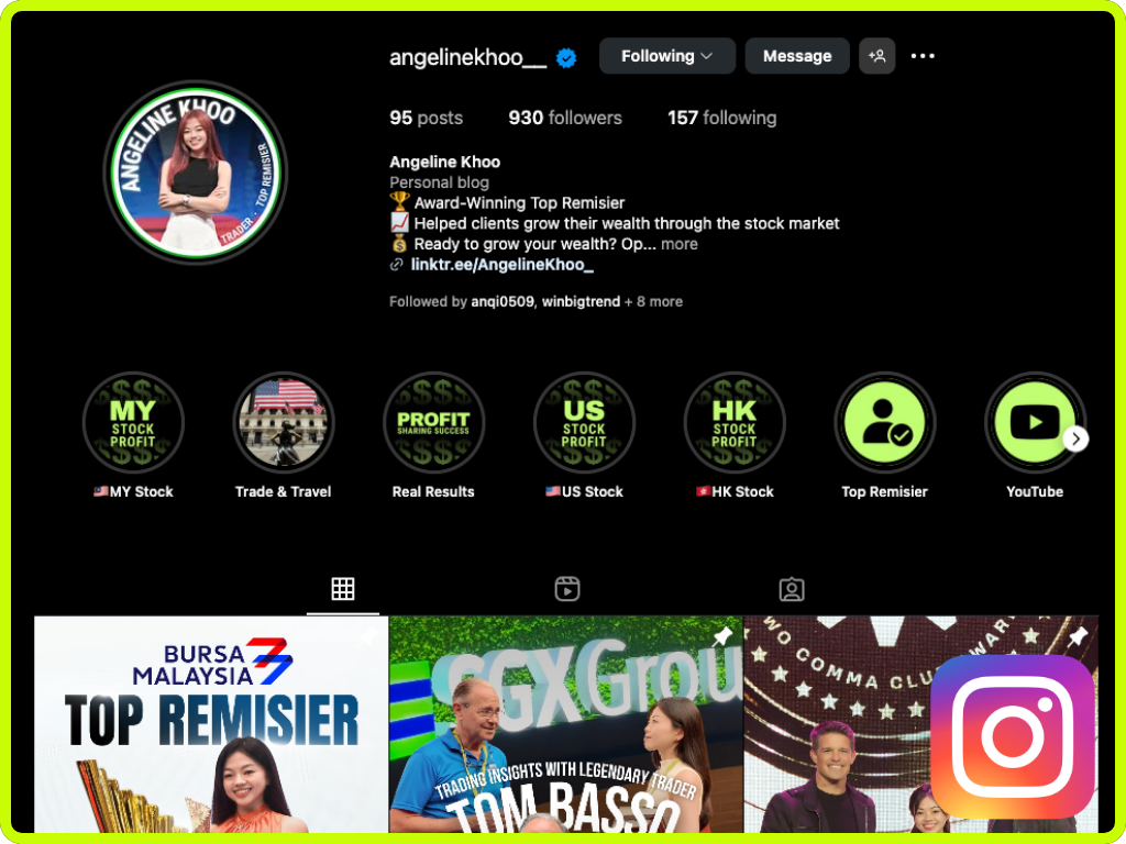 Through her daily stock updates, trend reports, and step-by-step guidance, Angeline has helped clients achieve their own “All Green Portfolio.” She believes trading is not just about numbers — it’s about creating a lifestyle of choice, growth, and freedom.