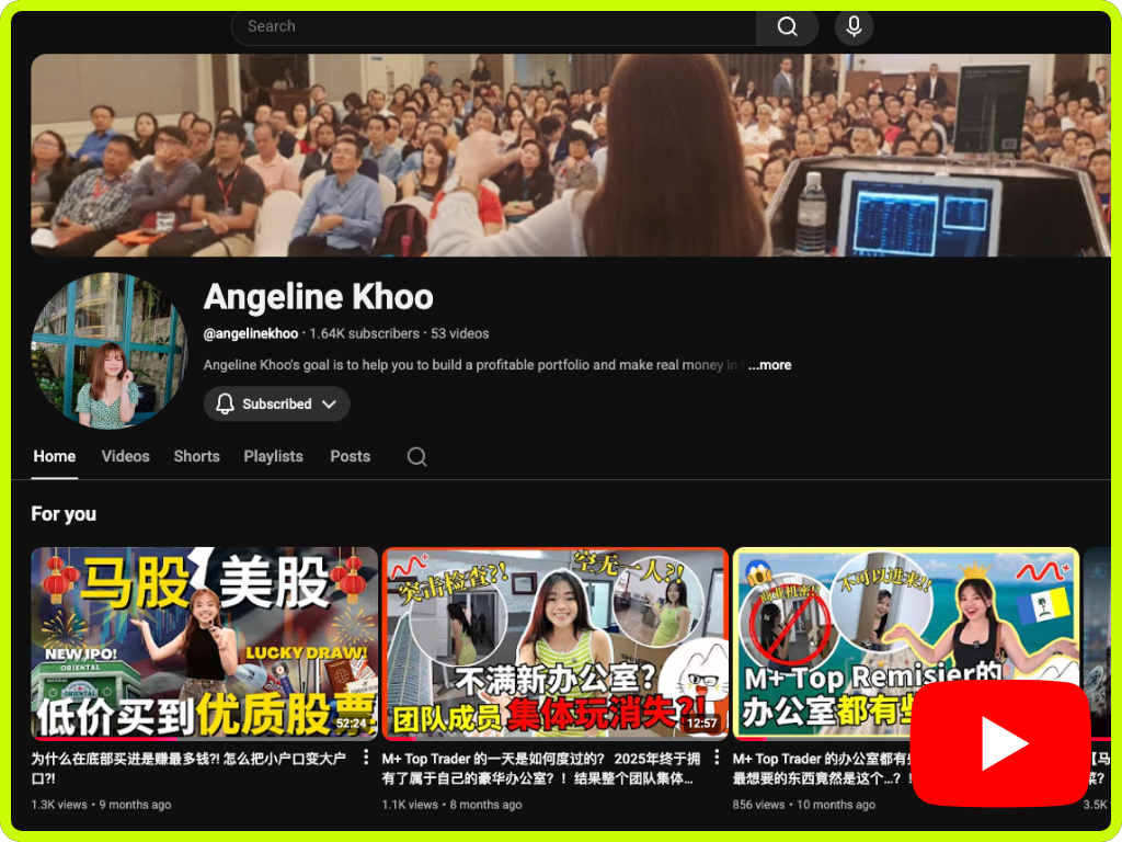 Angeline Khoo is a Bursa Top Remisier and Licensed Stock Broker with Malacca Securities. Over the years, she has helped thousands of investors grow their wealth through the stock market. She has also been invited to share her market insights on CityPlus Radio and at the M+ Global Round Table Session, where she exchanged ideas with leading figures and top professionals from the investment industry.